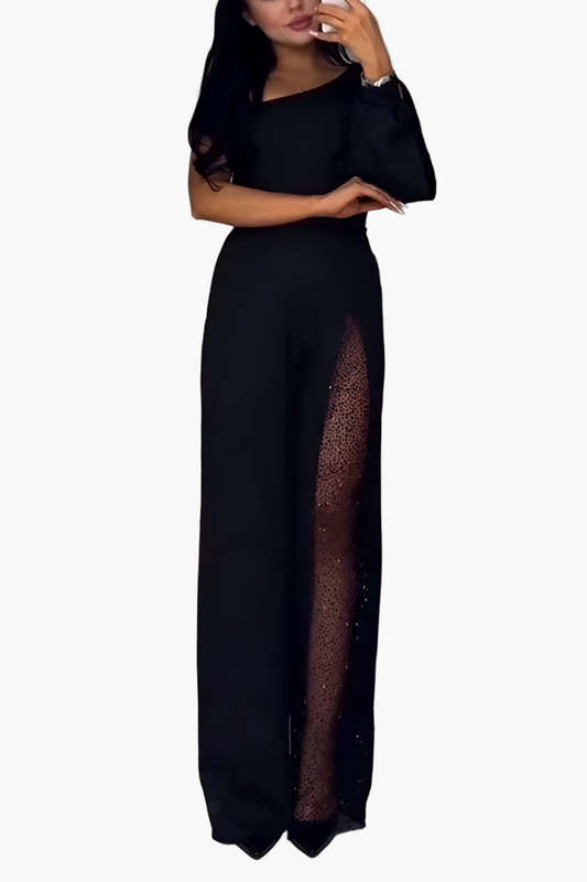 Damen Elegante Einarmige Jumpsuit mit Weitem Bein und Glamour-Einsatz – Perfekt für Abend und Party