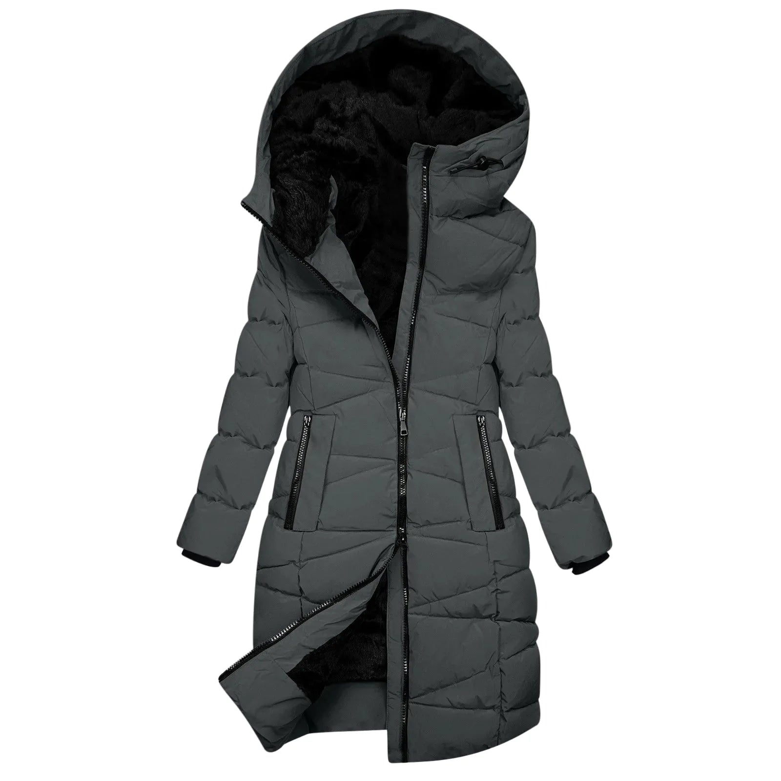 Experience winter in full warmth and style with this long quilted coat for women. The modern, windproof down jacket with a generous hood and full-length zipper offers optimal protection against cold temperatures and wind. The clean, solid-color design, relaxed fit, and distinctive zippered pockets emphasize your fashionable appearance – whether shopping in the city, traveling, or taking a winter walk.