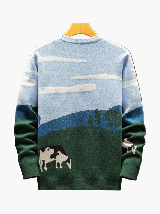 Men's Sweater with Landscape and Cow Motif – Casual Knit Sweater for Autumn and Winter